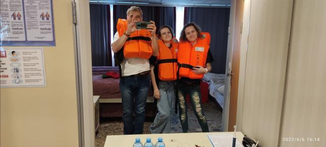 Оговорюсь сразу же, что тур наш начался 6 июня о чём говорит датировка фотографии выше, а фото теплохода в первом сообщении датировано 9-м июня. Так вышло, что лишь в Саратове, который мы посетили в этот день, удалось сфотографировать пароход во всей красе- до того обязательно что-нибудь его закрывало. Так или иначе, но по прибытии на борт нас сразу же проинструктировали на случай чего.