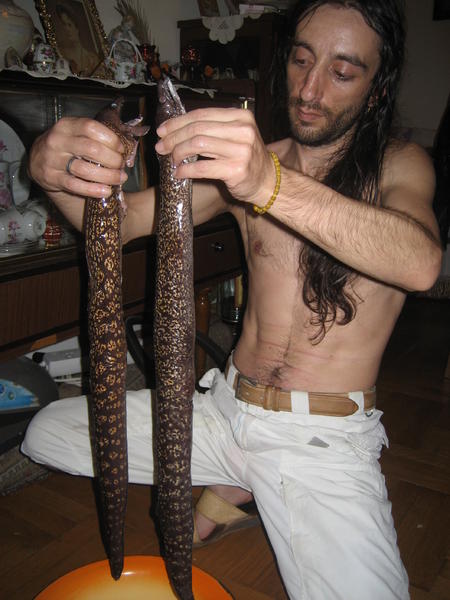 угри у нас тоже ловятся,только их больше в пресной воде можно выловить,но есть и в море тоже. их у нас ХЕЛИ называют (то ХЕЛИ) а мурен ЗМЕРНА . этих мурен кстати я на Афоне поймал. их там хоть пруд пруди,очень много,и наглые...видел даже как на берег выползали када я леску с рыбой тянул. не успела так сказать урвать мою добычу. вот после чего я собственно и стал их выуживать оттуда. пару раз леску обрывали(толстую кстати) на морду себе наматывает и тащит туда где камни острые,поближе к своей норе. ну я это..разозлился на них и примотал крючок-тройник на поводок из струны от гитары. тока так смог вытащить. а потом монтировкой по башке,шоп не дуже дергалась,а то они еси куснут то мало точно не покажется. думал думал шо з ними зробыть? у нас то их не кушают...как то обходят стороной,а на Азорских островах считается промысловая рыба. ну я кароч и приготовил по азорскому рецепту. но они ета...жииирные-епрст. их отмачивать надо в белом вине в начале. но потом ничего становятся. кушать можно)) еси тока не страдаешь холестирином от жирной пищи)) угри тоже жирные кстати,но у мурены мясо нежнее. ее до румянной корочки надо хорошенько прожарить,тогда мнямс*облизнулсо* и с белым вином просто прелесть,потом еще поваляться на песке и горланить свои любимые песни)) само то)))