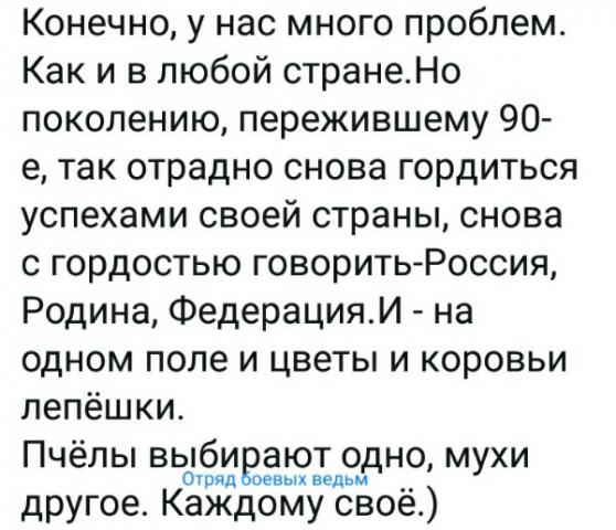 Величия России нам достаточно в виде речей с трибуны пару раз в год. А вот снова строить это самое величие – увольте... Мы сначала кредит за квартиру выплатим, поменяем машину, и еще дочку замуж надо выдать. Вот как только выполним обязательную программу, сразу займемся и величием России. Но не раньше.