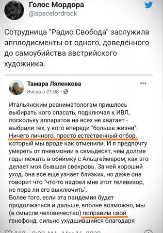 Георгий как журналист прекрасно знает, насколько легко искусственно создаётся психоз. Когда кругом со всех тарелочек подаются только такие новости, и общество ими напиталось, и ждёт других таких же новостей, просыпаясь утром. Тут и здоровые психически люди сходят с ума. Слепо копируются меры - запретить полеты, выезд, закрыть границы, закрыть рестораны, закрыть метро. Надо ли это в самом деле, есть ли необходимость - неважно. Все сделали и мы сделаем, и срочно отчитаемся. Это проще, чем узнать, каким образом тот же Китай задавил почти коронавирус, и отчего там число заражённых с 1 500 человек ежедневно упало до 10-15. Не-не-не. Кого это ебёт.