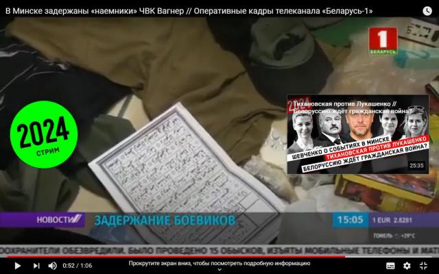 Телеканал «Беларусь 1» опубликовал сюжет, в котором демонстрировались вещи задержанных в Минске российских граждан. В их числе были нашивки с черепом и надписью «Наш бизнес смерть и бизнес идет хорошо»; листовка с арабской вязью; доллары, российские рубли и деньги Судана; инструкция к детектору для военных; платок-арафатка; российские паспорта; презервативы, сообщает Tut.by.