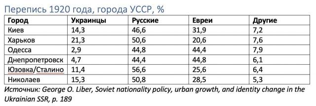 Ровно 100 лет назад в Советской России была проведена первая перепись. Вот результаты по основным городам Украинской ССР. Как видите, тогда (до начала тотальной украинизации) украинцы являлись даже не второй этнической группой.