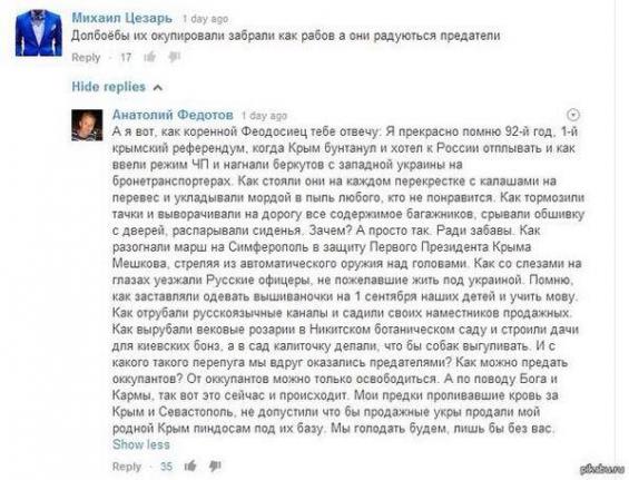 А вот три недели назад мне "посчастливилось" познакомиться с новой субстанцией этого мерзопакостного народца, и я сам классифицировал их, как "с…чье племя оккупант-эстетов". Захотелось увидеть своими глазами, "пощупать" и описать в статье тот мир, который принес в Крым русский агрессор. А потому, чертыхаясь и проклиная все на свете, пришлось ехать в Симферополь, потратив на переход через пункт пропуска "Чонгар" более семи часов. Большой репортаж о полуострове образца 2015 года я опубликую в начале следующей недели, а пока – об оккупант-эстетах.