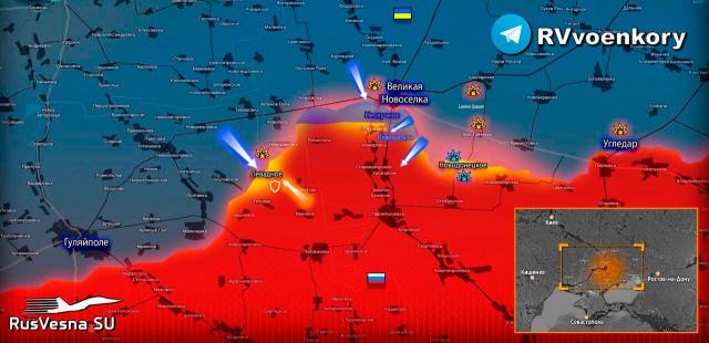 ▪️В сегодняшней сводке Минобороны за вчера прямо подтверждается продвижение врага на Времевском выступе, там сказано, что авиация ударила по скоплениям живой силы и техники 1-й бригады президента Украины, 110-й бригады терО, 72-й механизированной и 1-й танковой бригад ВСУ в районах н.п. Новодонецкое, Нескучное, Сторожевое и совхоза «Октябрь» ДНР (как раз 3 села, где прорыв ВСУ).