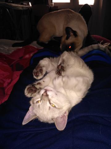 Обзавелись мы в ноябре второй кошкой. 19.09.16 года выпуска. При том, что старая наша кошь, Соня, 20.07.2001г.в., ещё вполне на ходу. Инициатором покупки, разумеется, стала малявка, утверждающая, что Соня- папина кошка, её (малявку) в грош не ставит. Надо сказать, беспокоились: как-то Соня отреагирует на конкурентку. Вот- реакция:Вложение 11512