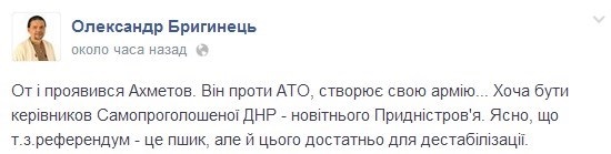 Вот и проявился Ахметов. Он против АТО, создает свою армию... Хочет быть начальником самопровозглашенной ДНР - нового Приднестровья. Ясно, что т.н. референдум - это пшик, но и этого достаточно для дестабилизации.