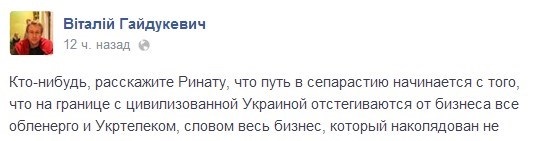 Кто-нибудь, расскажите Ринату, что путь в сепарастию начинается с того, что на границе с цивилизованной Украиной отстегиваются от бизнеса все обленерго и Укртелеком.... Ах, да, Банковая, решитесь наконец на национализацию бизнеса одного очень федеративного олигарха, пусть радуется бытию в пределах двух областей.