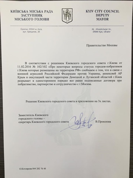 Киев расторг соглашение о товариществе, партнерстве и сотрудничестве со столицей России Москвой. Соответствующее письмо подписал в четверг, 12 мая, заместитель киевского городского головы Владимир Прокопив. Копию соответствующего документа чиновник обнародовал у себя в Facebook.