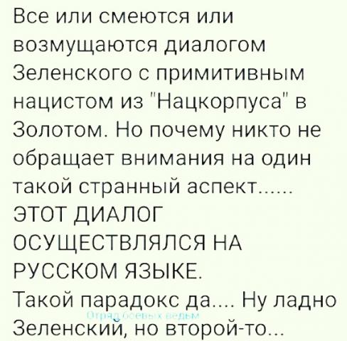 Мы часто говорим и пишем о том, что когда-нибудь мы вновь станем понимать друг друга. Мы вновь вспомним о едином народе. Может быть. Я не знаю народа. Я знаю конкретных людей. И честно, я не хочу, точнее, не смогу никогда драться с врагом в одном окопе с полковником Ждановым. С солдатом ВСУ, что сегодня воюет на Донбассе, наверное, смогу. И офицером из окопников смогу... А с карателем или вот таким вот полковником никогда... Такой вот я не толерантный человек...