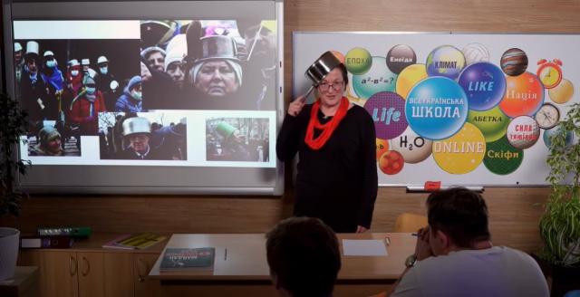 С какой целью преподаватель истории надела на голову кастрюлю, рассказывая на телеуроке детям о Майдане я не знаю, но вышло ярко.