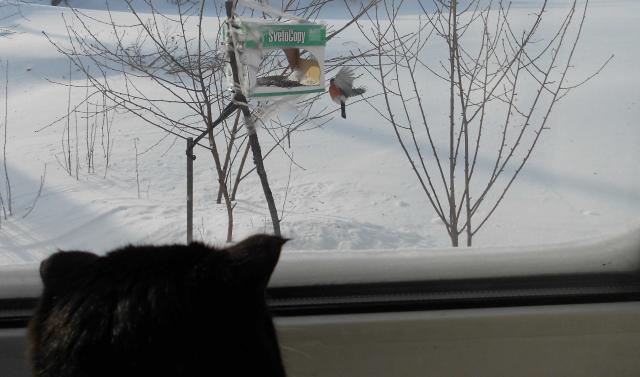 Прилетали какие-то красноголовые ( - щеглы, - по картинкам похожие) в эту же кормушку, ну, а сереньких да зелёненьких курочек - не счесть. Свиристели - вообще, как павлины, красавцы..