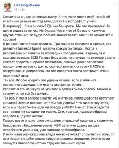 Антересно Лизонька рассуждает. Дескать, ничего страшного не будет, если долги отдавать не будем. Ну, мол, новых кредитов не будут давать, ну и пусть.
