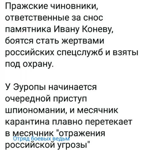 Пражские СМИ вообще закатили истерику, после того как стало известно, что СК РФ открывает уголовные дела против чиновников, имеющих отношение к сносу памятника маршалу Коневу. Так столичный еженедельник Reflex призвал президента страны Земана отреагировать на «угрозу» зеркально и осудить «российских шпионов», сообщивших в Москву, кто именно стоит за демонтажем памятника Коневу. Писаки предупреждают, что русские силовики могут приехать за провинившимися чинушами на танках, осудить их на месте и привести приговор в исполнение. Они напомнили, что советская армия занимала Чехию больше 20 лет. А Конев ведь был маршалом этой армии.