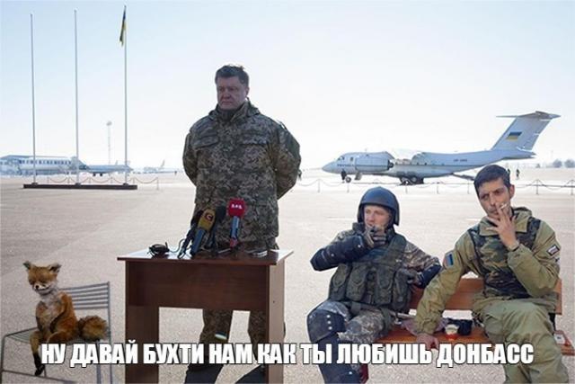 Ещё, значит, история про деда Тараса. Стоят хлопцы, а на них сепары прут. Ну хлопцы побили, естественно, всех сепаров. И ещё конно-космическую армию рашкинскую, чтоб два раза не ходить. И тут видят, летит на них Ка-52! А патронов нет, последних конно-космонавтов добивали голыми руками, ногами, жо... кто чем мог, короче. А тут Ка-52. Ну, приготовились хлопцы помирать, чё делать. Позвонили родственникам, погрустили, выпили на прощание, взгрустнули... выходят из блиндажа, летит, сука, никуда не делся. И тут встаёт старый вояка дед Тарас. Говорит - сынку дай-ка мне весло. Ну хлопец сбегал, протягивает СВД. Дед говорит, ты дюже дебильный хлопец, патронов же нема, дюралевое неси. Принёс хлопец весло... Тарас его на бочку ставит качелькой, да как прыгнет на верхний конец. Весло подлетает и задний вентилятор Ка-52 сносит. Ну Ка-52 начинает мотать, налево... в стаю МиГов влетел, всех на гусеницы намотал, направо... гаубицу бомбардировщику отрубил. А потом как в Кремль с разгону хрясь! Путину башку с плеч, а Тарасу Обама орден дал - Герой Планеты. Так-то вот!