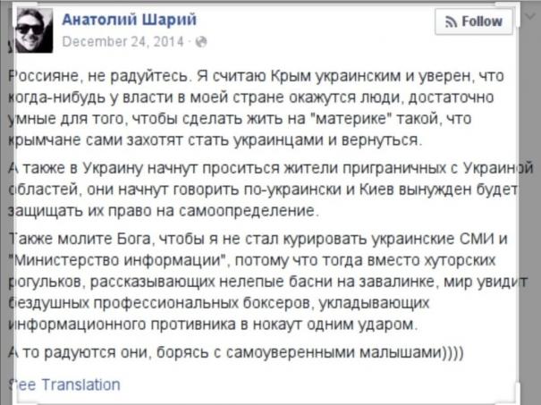 Так что - никогда мы не будем братьями, никогда Шарий не станет президентом, а его партия - большинством в Раде. В том числе и потому, что он хочет стать именно украинским президентом, и партия видится именно в Раде... а это шоу со всем этим блядским цЫрком ИМХО пора бы уже и прекратить.
