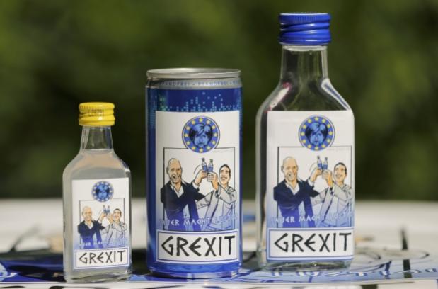 На этикетке напитка изображен премьер-министр Греции Алексис Ципрас, который выпивает с министром финансов Янисом Вароуфакисом. А над ними с мрачным выражением лица нависла синяя Ангела Меркель. На этикетке также есть надпись: "Даже горькие фрукты хороши".