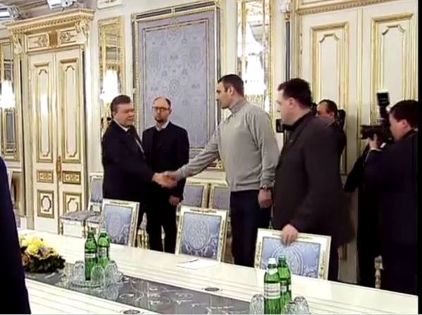 На Грушевского пришел Кличко, просит объявить перемирие до восьми вечера. В 13:00 начнутся переговоры с президентов, три основных пункта: Отставка президента, Роспуск парламента, Оменить "диктаторские" законы.