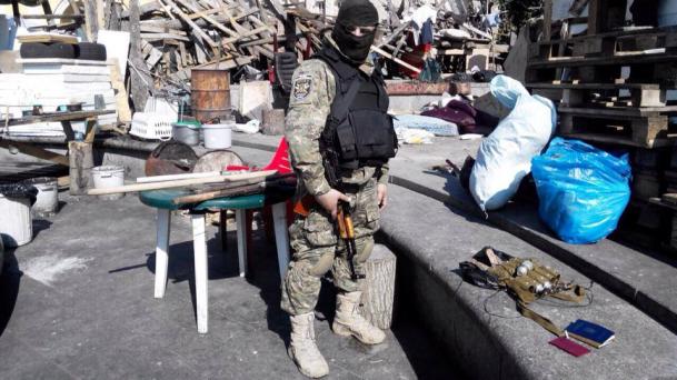Коммунальщики в бронежилетах ушли по улице Владимирской. Они были вместе с настоящими коммунальщиками и должны были их прикрывать. Уходя, они забрали кран, разбирающий палатки, и катались на нем.