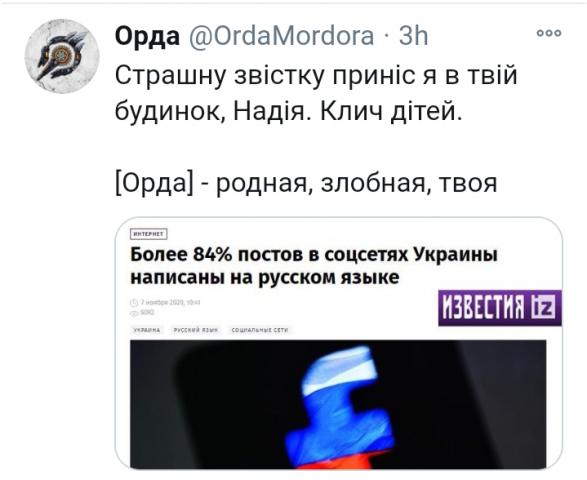 При этом даже огрызки закона Колесниченко, который фактически закреплял второстепенный статус русского языка (лишь бы не давать ему статус второго государственного), с точки зрения «Слуг народа», представляют опасность. То есть, если вы говорите на своем родном языке, вы уже тем самым представляете угрозу «национальной безопасности Украины». Этот депутат точно из «Слуги народа», а не из «Европейской солидарности» или «Свободы» Тягнибока?