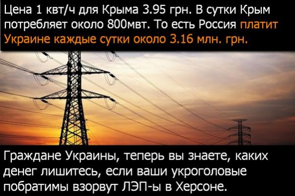 Сегодня началась блокада. Узнав на базаре эту новость, я летела домой как на крыльях. Вбежала домой и крикнула: «Украина блокировала Крым! Скоро нам нечего будет жрать!!!» Мать села на стул и заплакала. Отец встал, посмотрел на висевший на стене портрет нашего президента и сказал: «Я верил! Я знал! Родина нас не забыла!!!» Лежащий на диване дедуля прошептал: «Дождались», - по его щеке стекла скупая слеза. Андрейка заныл: «И шо, йогуртов теперь не будет?!», - но папаня дал ему подзатыльник и он замолк.