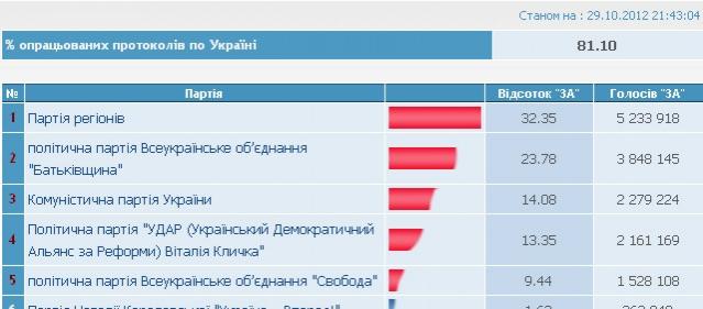 Представители Партии регионов продолжают лидировать в 111-ти округах, представители "Батькивщины" - в 40, "Свободы" - в 9-ти, "УДАРа" - в 5-ти, Народной партии – в трех, «Единого Центра» - в двух округах. В одном округе лидирует представитель партии "Союз", еще в одном - "Украина - Вперед!" и еще в одном - Радикальной партии Олега Ляшко.
