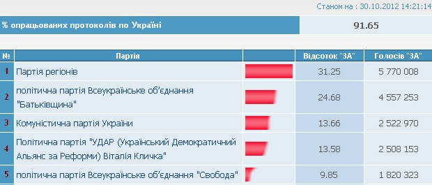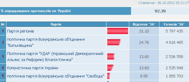 Как передает корреспондент УНИАН, такие данные обнародованы электронной системой «Выборы 2012» в Центральной избирательной комиссии. Согласно результатам обработки 29,79% протоколов УИК, за Партию регионов проголосовали 36,63% избирателей; за ВО «Батькивщина» - 21,02%; за партию «УДАР Виталия Кличко» - 12,64%; за Коммунистическую партию Украины - 15,28%; за ВО «Свобода» - 7,57%.