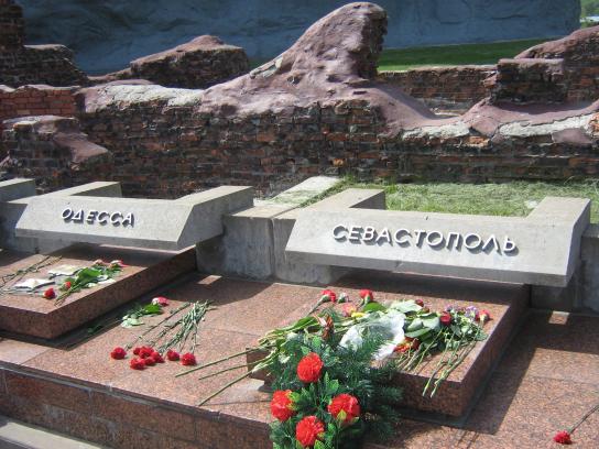 У входа на Мемориальный комплекс коммунисты развернули около 20 флагов КПУ и Знамен Победы.