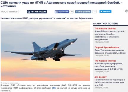 По сведениям источников телеканала CNN, бомба была сброшена с самолета "несколько часов назад", чтобы уничтожить тоннели и пещеры на востоке Афганистана, использованные террористической группировкой "Исламское государство" (ИГ, запрещена в РФ). Американские военные в настоящее время оценивают нанесенный экстремистам ущерб.
