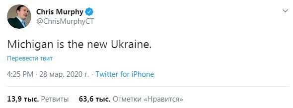 . Американский сенатор из Коннектикута описывает драматическую ситуацию с коронавирусом в расположенном неподалеку Мичигане. Получается, можно сказать, что Украина це новый Мичиган. СУГС!
