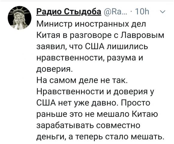 И как, сработала эта «лояльность»? Вознаградилась лесть? Я напомню цитату из выступления генерала Барра, он же генеральный прокурор Барр. На прошлой неделе он сказал: «конечная цель правителей Китая — не торговля с Соединёнными Штатами, а рейд на Соединённые Штаты».