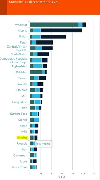 Украина заняла самый высокий рейтинг среди европейских государств по шкале вероятности массовых преступлений над мирным населением. По мнению аналитиков проекта, статистический риск того, что власти страны совершат массовые убийства среди мирных украинцев, составляет 1,7%. Для сравнения: в прошлом году этот показатель составлял 0,3%.