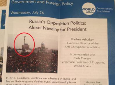 Исполнительный директор ФБК Владимир Ашурков в качестве раздаточных материалов привёз на лекцию в Сан-Франциско брошюры об Алексее Навальном и российской оппозиции, где на фото - оппозиционный митинг... Правда почему-то это Киев... Ну, то мелочи... Народу главное много на фото, а где там это происходит - уже не вопрос