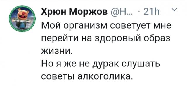 А при чем здесь это до попытки "культурно" похмелиться? ;) И раз уже о ней: культура состоит не в том, чтобы добавлять алкоголя в отравленный продуктами его распада организЬм, а в том, чтоб чОтко знать и соблюдать меру, при которой он не будет отравлен до такой степени, чтоб потом пришлось "лечиться"! :blum1: