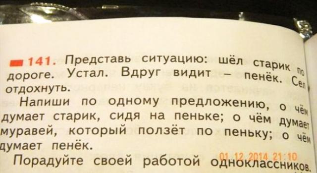 старик сидя не пеньке думал как бы не прищимить яйца и поэтому немного поеживался ,все время нервно водя попой в разные стороны. муравей подумал-ого,кажется он скоро ласты склеит,поэтому его надо обследовать,а вдруг его тушка на что то сгодится еще. а пень стоял в ступоре думая про себя -вот так...дожил,пень на пне сидит.