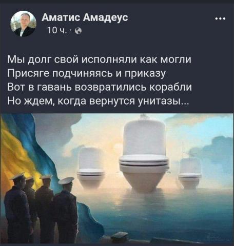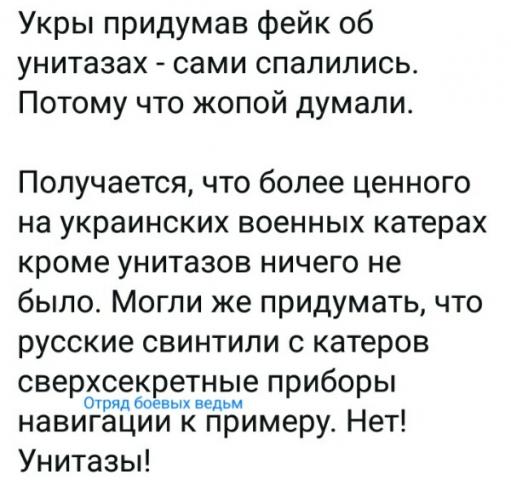 «Украинский моряк Андрей Эйдер с корабля "Бердянск" рассказал душераздирающие подробности о варварстве россиян. … Вопрос, боец, зачем тебе 20 пар? Как тут вновь не процитировать классику: «Что, солдат, ссышься?! Твой позорный недуг мы в подвиг определим: пошлем в десантники. Там ты еще и сраться начнешь», – написали авторы канала.