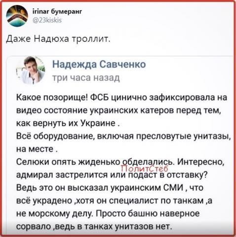 Вместе с тем в ФСБ подчеркнули, что если представителям Украины удалось повредить данные суда, а также довести сантехнику кораблей до неудовлетворительного состояния за время самостоятельной буксировки до порта города Очаков, «то это проблема самой украинской стороны».