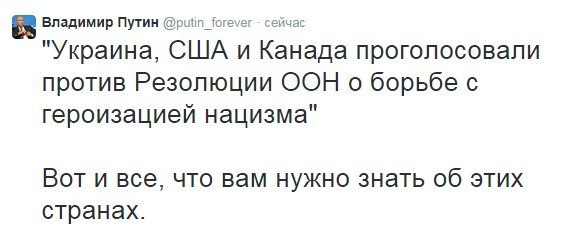 Думаю, всё-таки, надо об этих странах знать ещё кое-что. С САСШ и Канадой всё ясно, а вот Украина в этой компании впервые. Год назад было такое же голосование по аналогичной резолюции, которые РФ вносит на рассмотрение ГА ООН ежегодно.