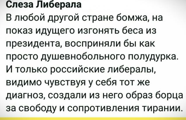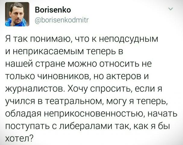 В сети поднялся ещё более дикий вой. Вой достиг небывалого накала, потому что выли все: Галкин, Палкин, Малкин и даже Залкинд. Даже 40 попов подключилось, не смогли остаться в стороне. Устинова задержали ни за что, немедленно отпустите прекрасного актёра!!! А не-актёра — случайно, не надо отпустить? Или ваша актёрская диаспора заботится только о своих? А вот на Донбассе ежедневно обстреливают мирные города из гаубиц, убивая невинных женщин и детей — что-то от вас по этому поводу никакого воя ни разе не было слышно — это почему? Но в целом, конечно, весьма показательно: «борцы за права и свободы» организованно и дружно оказывают давление на независимый суд. Что, как мы знаем с их же слов, в приличных странах решительно недопустимо.