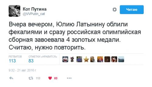 – Не особенно. Но мои коллеги, бразильские фелинологии, рассказали интересную историю. Местный кот Карлос, живший при олимпийском бассейне в Рио, допил минералку, оставленную в раздевалке двадцатиоднократным олимпийским чемпионом Майклом Фелпсом, после чего внезапно взъерошился, вытаращил глаза, домчался до пляжа и пересёк Атлантический океан стремительным баттерфляем за несколько часов. Его обнаружили на одном португальском пляже, когда он продолжал грести по песку, оставляя за собой ровную борозду. Он грёб лапами в воздухе ещё несколько часов, даже после того, как его доставили в ветеринарную клинику. А самое интересно, что США сразу потребовали у Португалии его немедленной выдачи, как лица, причастного к международному терроризму, категорически запретив брать у него любые анализы.