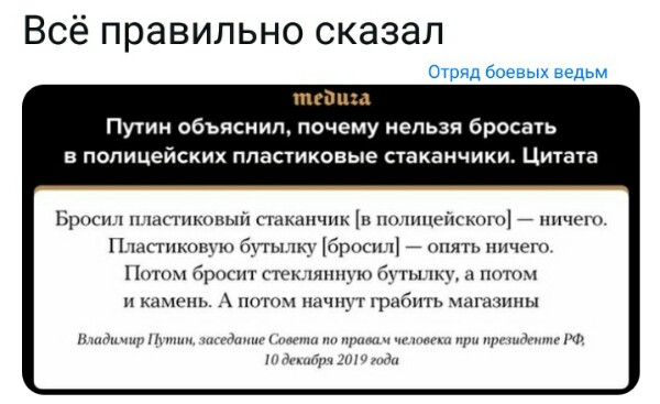 И уж точно - прав Владимир Владимирович оказался насчет стаканчиков, бутылок пластиковых, бутылок стеклянных (там было звякнуло - хотя, может, и айфончек или фотичег чей...) - а уж магазины там, по опыту других стран, воспоследуют, если полиция вовремя и жОстко (хотя бы даже как вон опять-таки коллеги ваши - наотмашь по всему чему попало) не удержит.