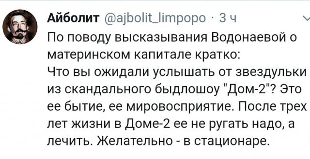 Ранее Водонаева заявляла, что «отчаявшиеся из-за низкого материального положения граждане» или «быдло, которому вечно не хватает на бутылку водки», начнут заводить детей ради выплат, что может стать «роковым для будущих поколений».
