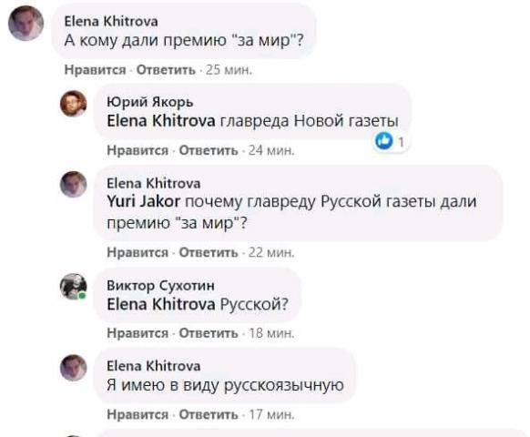 Норвежский нобелевский комитет присудил Нобелевскую премиюза ложь, фейки и провокациимира 2021 года главному редактору "Новой газеты" Муратову и филиппинской журналистке Марии Рессе. Комитет решил присудить премию за "их усилия по защите свободы слова, что является предпосылкой для демократии и прочного мира".
