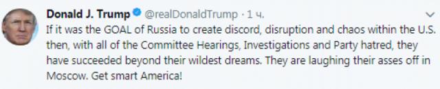 Если у России была цель создать разногласия, разрушения и хаос в США, то с учетом всех слушаний комитетов, расследований и межпартийной ненависти они преуспели свыше своих самых смелых надежд. Они надрывают животы от смеха в Москве. Поумней, Америка!