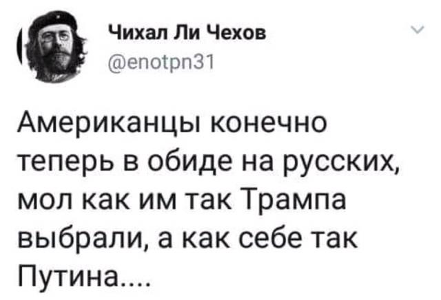 — Какие брови?! Британия находится под русской химической атакой, Дональд! Я даже ночную пижаму сменила на костюм химзащиты. А ты этого тирана поздравляешь. Ты ему еще бутылку портвейна пошли!