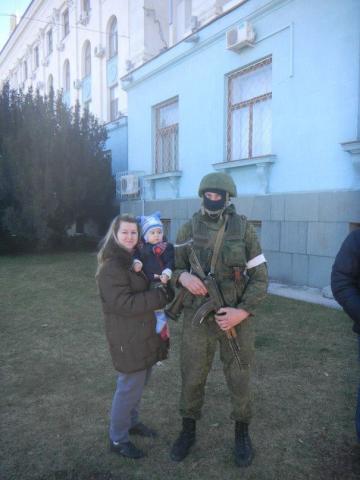 Более того, мирное население Крмыа и окрестностей стуча зубами от страха и периодически , меняя памперсы продолжает лезть как можно ближе к Вежливым людям в военной форме. Более того...даже детей малых приобщаютЬ:morning1: