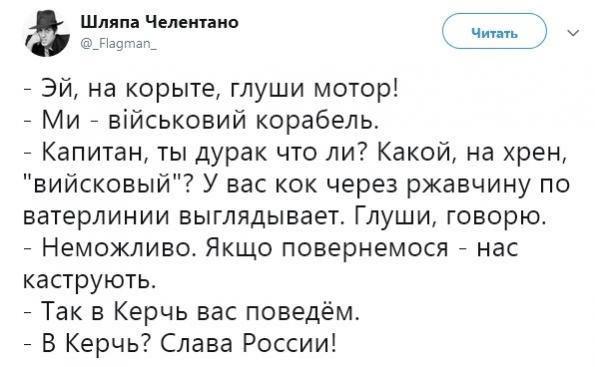 В-четвёртых, у кацапов есть линкор на Чёрном море? То-то, что нет! А у нас – будет. И у него будут такие могучие, такие фаллические пушечные стволы, каких сейчас с днём с огнём на флоте не сыщешь. И сразу видно, кто на море хозяин! (Предложение женской части коллектива).
