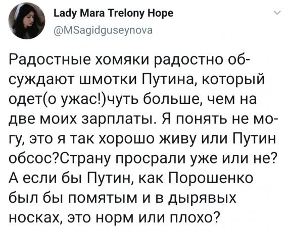 Порошенко. Большевик с броневика ;) - точнее, эсэр из полуевреев, пытающихся маскироваться под местные нац.кадры. :) Пришел к власти на волне народной революции, выдвигавшей совсем другие лозунги, и гражданской войны. Попытался преодолеть разруху НЭПом - под собственным мудрым и внимательным (особенно к валютным потокам) руководством, нараздавал концессий буржуям - при непременном желании не выполнять условия, если они не нравятся, и в итоге кинуть всех. Проводил жОсткую украинизацию, с полным национал-уклонизмом, ненавистью к "малороссам", обязательным обучением мове и т.д. Поддерживал революционные самосуды масс и фанатиков в странных шапках псевдоисторической формы. В мечтах устраивал украинизацию едва ли не всей Вселенной и по этому поводу пиздел как Троцкий. :) Точно так же, как упомянутый ставленник американских банкиров - не удержал власть, был равноудален в мечты о реванше, ставленников осталось дохрена и они шатают государство как могут.