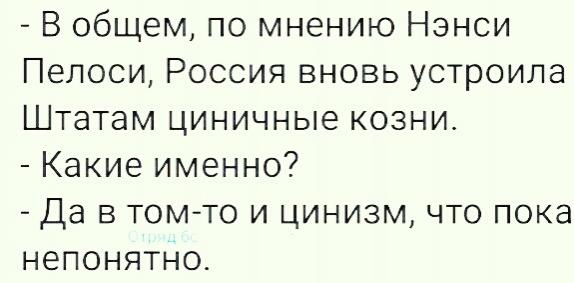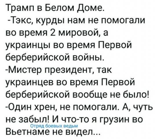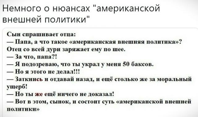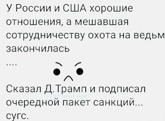 - Ну тут такое дело, - жался Трамп. - У меня опыта в политике нет. А тут меня как пошли валять на все корки - ты России продался, тебя русские избрали, ну я и стал изображать, что за санкции, и все дела. Слушай, ты должен понять. Кресло мягкое, мне там сидеть нравится. Я не хочу импичмент. Поэтому да, пришлось вам подосрать.