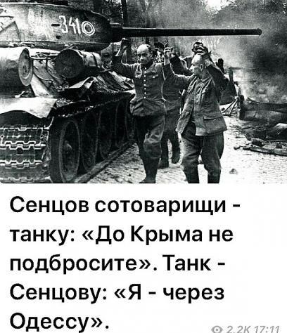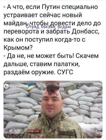 «Ю-ЩЕН-КА! Ю-ЩЕН-КА!», - громогласно пронесся боевой вопль со стороны вооруженных людей и на встречу киборгу Ержану кружась мелкими восьмерками боевого гопака выкатился здоровенный детина в балаклаве, вышиванке и с жовто-блакитным прапором. «Ще не вмерла Украина!», - грозно рявкнул детина. «Я грузин! Дякую тоби боже, що я не москаль», - ответил ему киборг Ержан. Напряжение резко спало. Украинцы и грузины обнимались со слезами на глазах, пели гимн Украины и «Чита-дрита». Это была передовая команда ВСУ под командованием обер-есаула Семена Семенченко. Украина открыла второй фронт и заявила о возвращении всей Кубани в состав Украины. Краснодар решили оккупировать совместно.