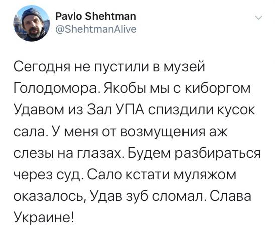 Молния! Третьего дня произошло беспрецедентное событие. Режим заблокировал официальный твиттер отца украинской нации, экологического активиста, киборга, майданника-переможника, трамваездувальника, маршруткокатувальника, метроскакуковальника, гимноспевувальника, евангелиста Небесной сотни и завсегдатая Зал УПА в Музее Голодомора. Впрочем не сказать, что это какой-то неожиданный факт со стороны КГБ – к пану Шехтману прислушивались в твиттере пан Порошенко, Далай-Лама, Ольга Бузова, Илон Маск, Венцеслав Венгржановский, пан Зеленский, пан Гимун, Бжорк, лойер Марк Фейгин и Саша Сотник. Павло Шехтман вывел пение гимна Украины на новый уровень, призвав украинских патриотов распивать его в трамваях, маршрутках, пииздах, летаках и гвинтокрылах. Его уважали все таксисты Киева, оперативно делясь свежими кремлевскими инсайдами об очередной истерике террана Влада Путина. Цыганский барон Подола Ратмир даже подумывал женить его на своей старшей дочери Саре, чтобы обеспечить династический брак с прямым наследником Степана Бандеры. Павел Шехтман является одним из влиятельнейших криптоинвесторов Украины и регулярно проводит мастер-классы на семинарах по успеху. Шехтман и его киборги держат Подол, обеспечивая местным торговцам защиту от нападений патриотов из батальона «Айдар» и полка «Азов». Кроме того, пан Шехтман является крупным филантропом, собирая средства ребятам на броники в АТО у метро «Майдан Незалежности» под незатейливой табличкой «Помогите на бухло».